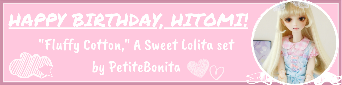 PetiteBonita is a wonderful shop for cute ball-jointed doll clothes! The shop always has adorable lolita, school uniforms, costumes, and anything else your cute doll could want. Since it is Hitomi's fifth birthday, I wanted to spoil her a bit with a full Sweet Lolita set from the shop. It didn't disappoint!