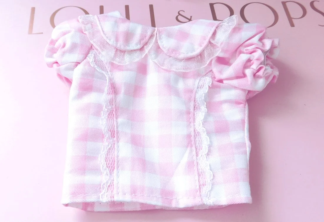 The blouse has a zipper at the back to get Hitomi in, or out, of it easily. I love the lace along the bodice, and the ruffled collar as well. I'd love to pair this blouse with a skirt to show the gingham off.