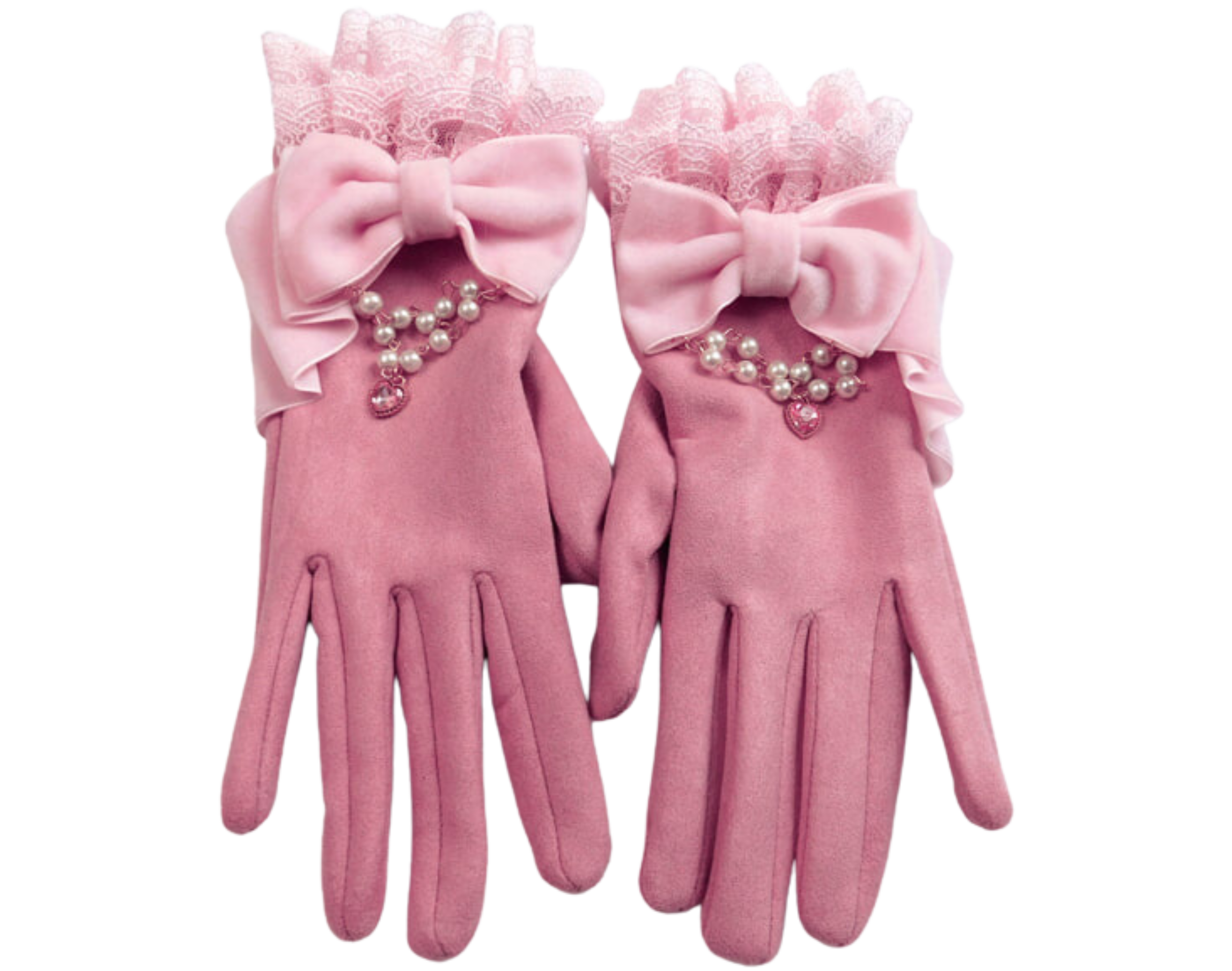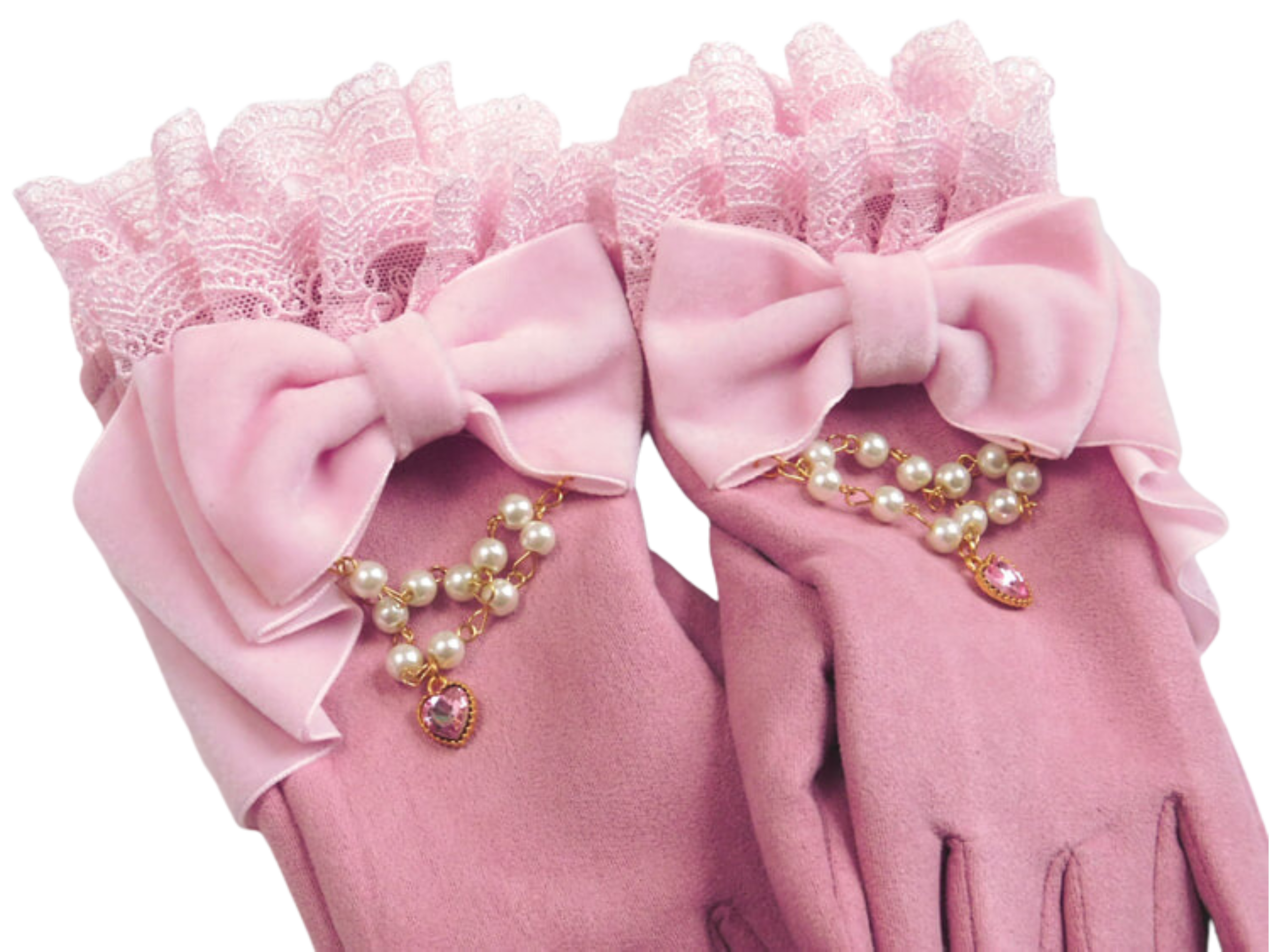 These winter gloves are beautiful. I am in love with the entire design! The contrast of the dark pink suede with the light pink velvet looks lovely. It also allows for more coordination opportunities. All of the material, from the suede to the velvet and lace, is very soft. I really like how the base of the gloves look like a wrist cuff. To add some additional elegance to these accessories, the designers added a chain of glass pearls. With the small heart-shaped gem, these gloves do make a statement!