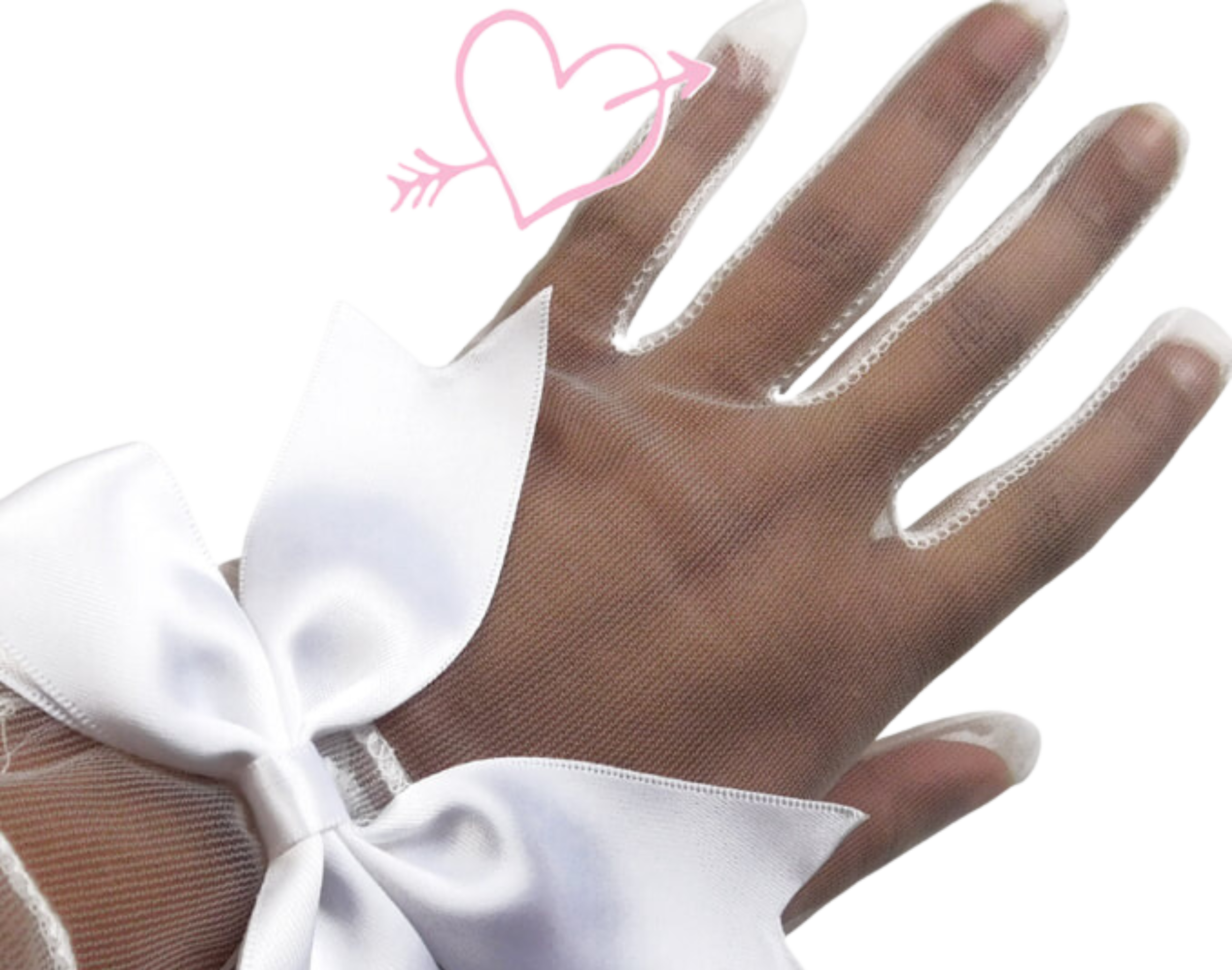 The details of these gloves are precious! Between the folded ribbons to the intricate lace, the design is fantastic. I did notice that the heart gems are two different color pinks, but it is barely noticeable.